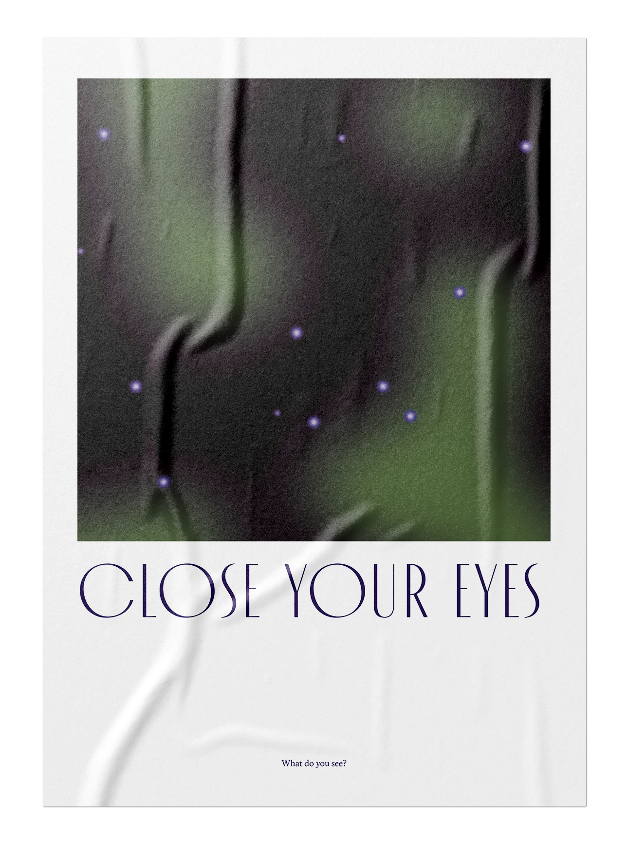 "Close Your Eyes. What do you see?" Can you also perceive the dancing little lights that I tried to visualize in this poster?